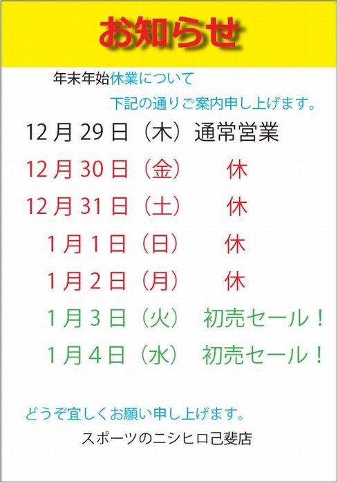 ¥¹¥Ý¡¼¥Ä¤Î¥Ë¥·¥Ò¥í¸ÊÈåŹ¤ÎǯËöǯ»Ï¤ÎµÙ¶ÈÆü¤Ë¤Ä¤¤¤Æ¡¢²¼µ¤ÎÄ̤ꤴ°ÆÆâ¿½¤·¾å¤²¤Þ¤¹¡£